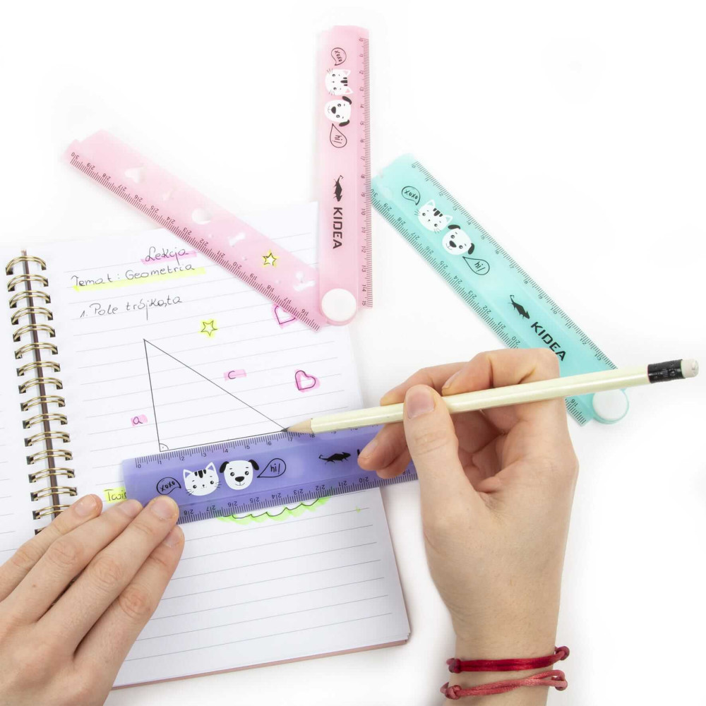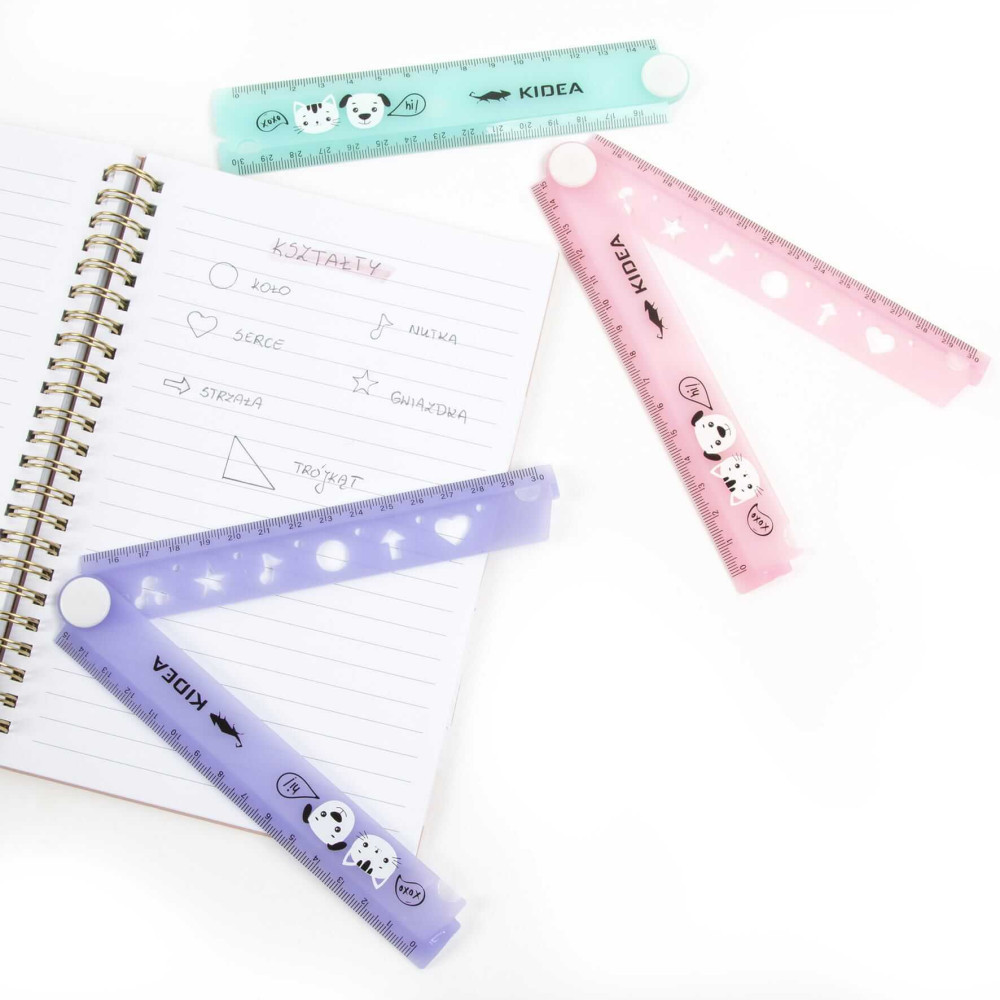 Összecsukható vonalzó, így könnyedén elfér a táskában, tolltartóban. A vonalzón különböző formájú sablonok is találhatók.