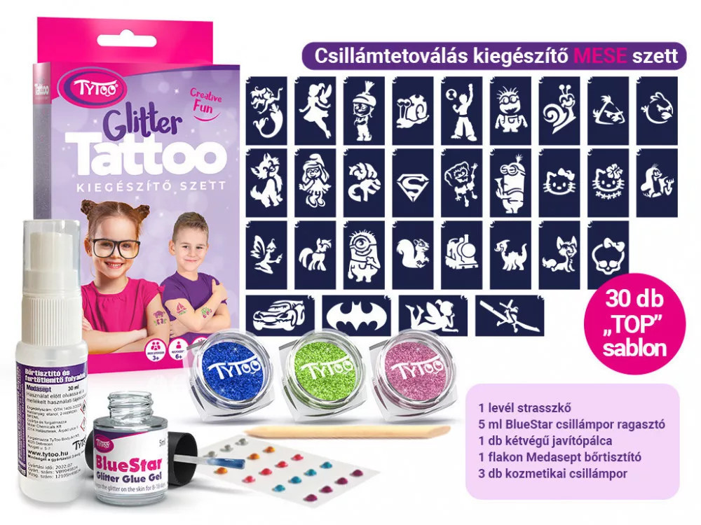 Csillámtetoválás kiegészítő készlet, mese szett (30 sablon, ragasztó, mozgó szem, strasszkő, csillámpor, bőrtisztító)