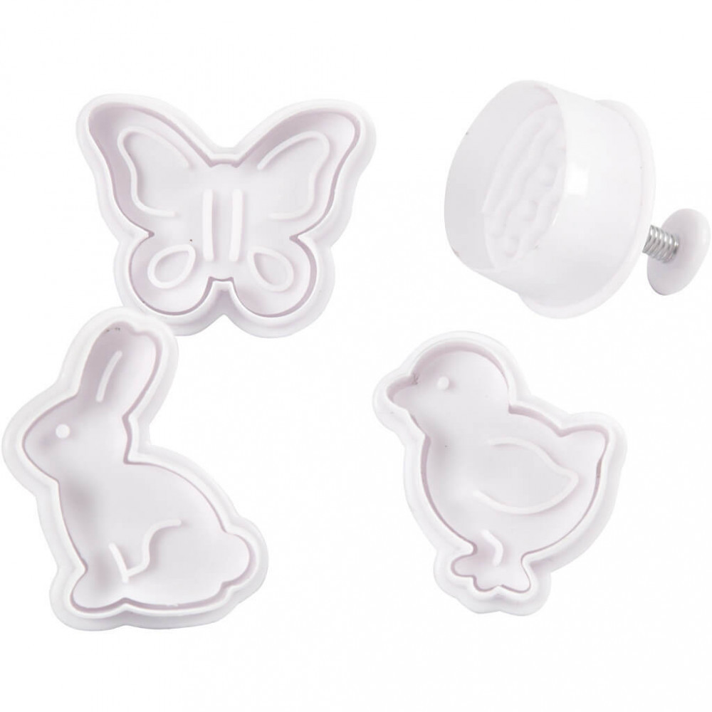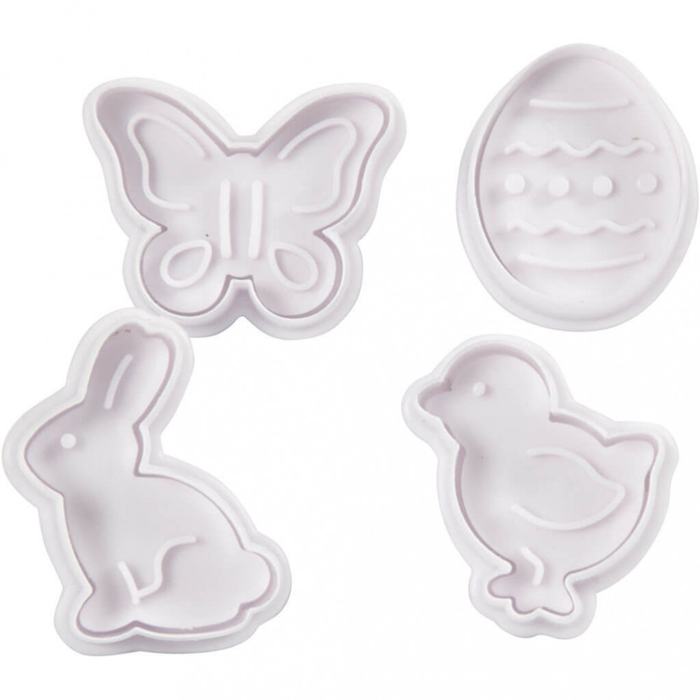 Húsvéti süteménykiszúró szett, műanyag, 4 db/csomag. Bélyegzős forma. Méret: kb. 5 cm. Klepke, tojás, nyuszi és csibe.