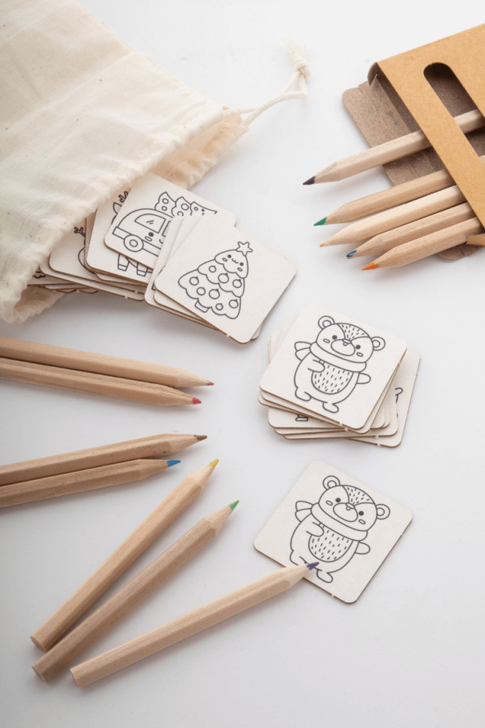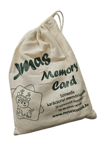 Karácsonyi, mini színezhető memóriajáték pamut tasakban (24 db lapocska + 12 db színes ceruza). Karácsonyi motívumokkal ellátott karton memóriajátékot (24 mini lapka) és 12 db papírdobozban lévő fa színesceruzát tartalmaz. A tasak mérete: 13x17cm. A kártyák mérete kb. 3,5x3,5cm.