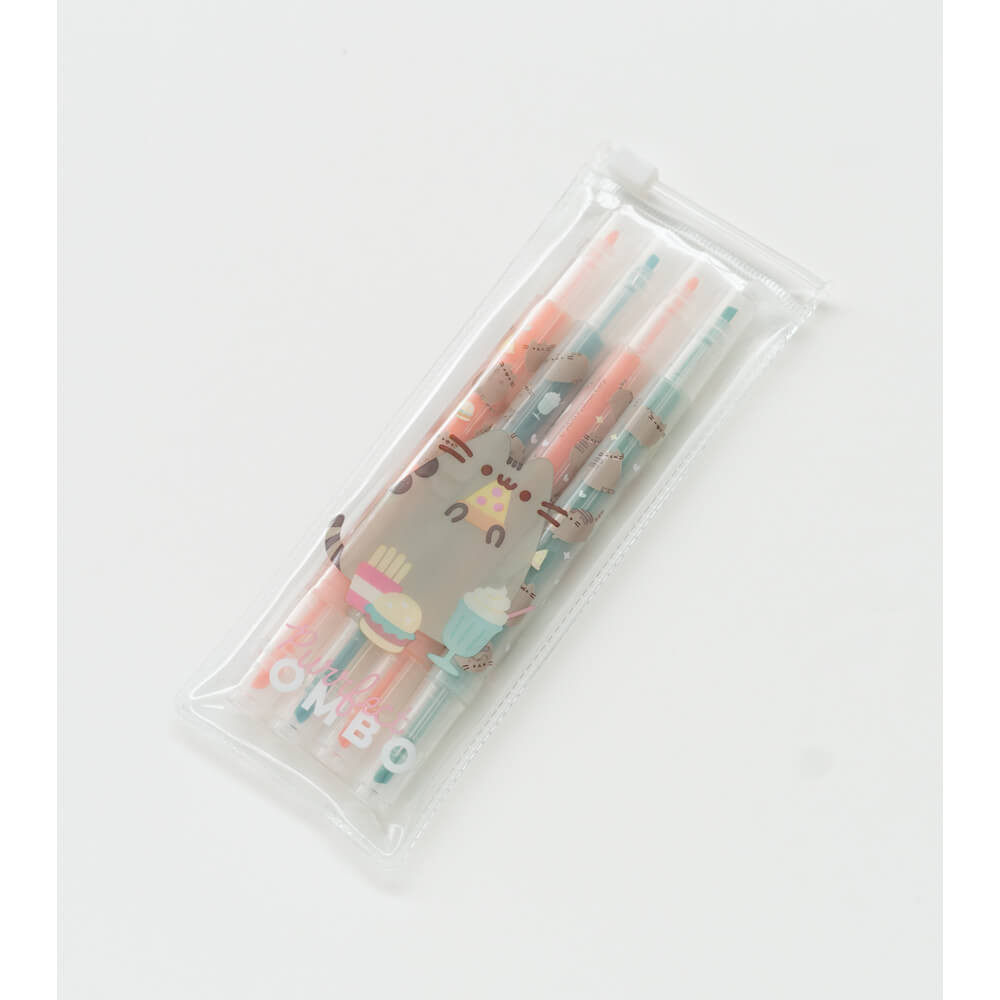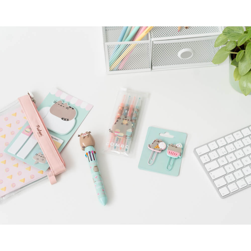 Pusheen cicás írószer szett, Foodie Collection. Tartalma: jelölőcímkék, 4 db szövegkiemelő, 10 színű golyóstoll, 2 gémkapocs, műanyag tasak.