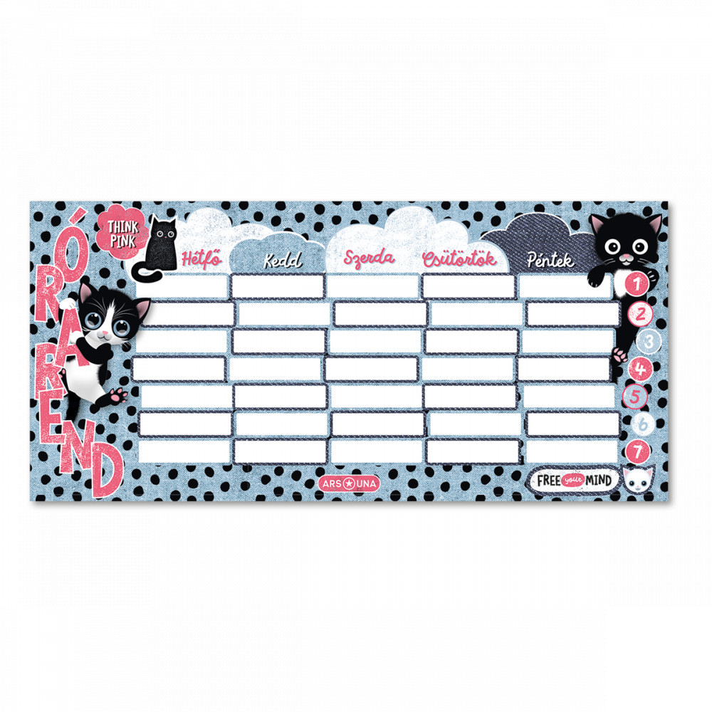 Think-Pink, cicás órarend, 23x11 cm, kétoldalas. Kétoldalas, magyar nyelvű órarend A és B hét beosztással. 250 gr-os félfényes műnyomó papírra.