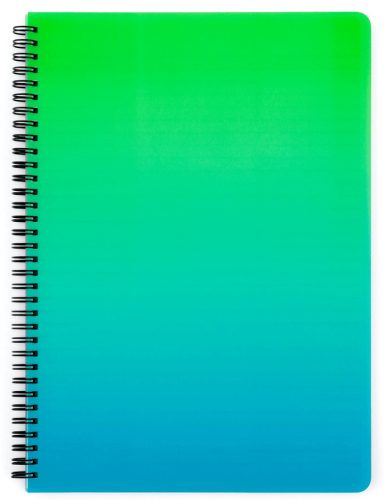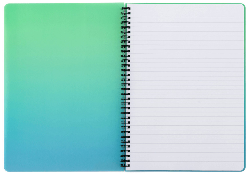 Spirál füzet A/4, vonalas, 60 lapos, műanyag borítóval, OMBRE, zöld-kék. Perforált lapok. Méret: 225x300x8mm. Lapok: 70g/m2. Borító anyaga: polypropylen.